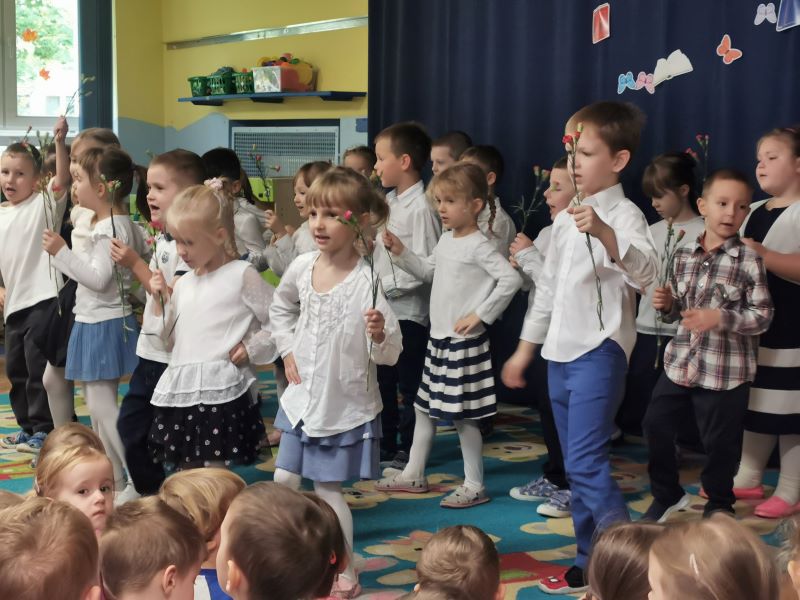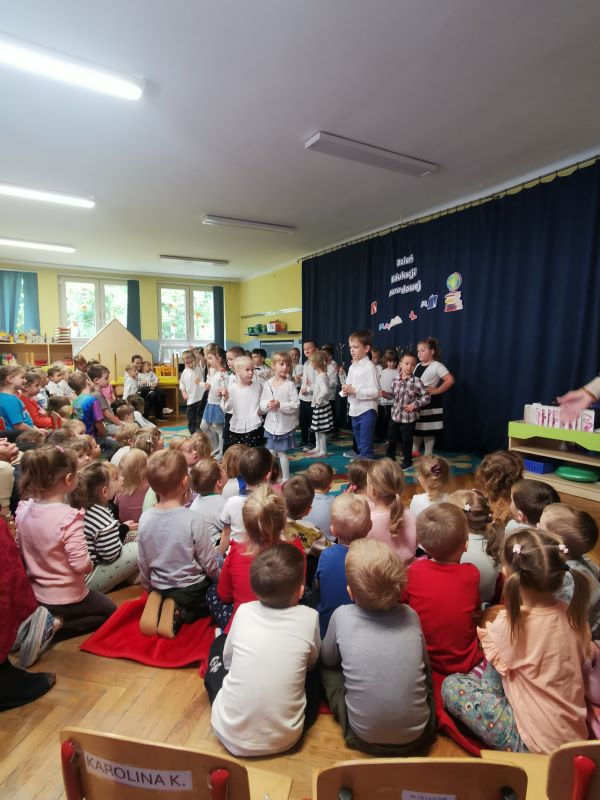 Z okazji Dnia Edukacji Narodowej dzieci z IV grupy przygotowały wyjątkowy występ, który odbył się dla całego przedszkola oraz kadry pedagogicznej. Mali artyści z ogromnym zaangażowaniem zaprezentowali swoje umiejętności – śpiewali piosenki, recytowali wierszyki oraz zatańczyli przygotowany układ taneczny. Na zakończenie występu dzieci wręczyły kwiaty wszystkim pracownikom placówki, wyrażając w ten sposób swoją wdzięczność i sympatię.